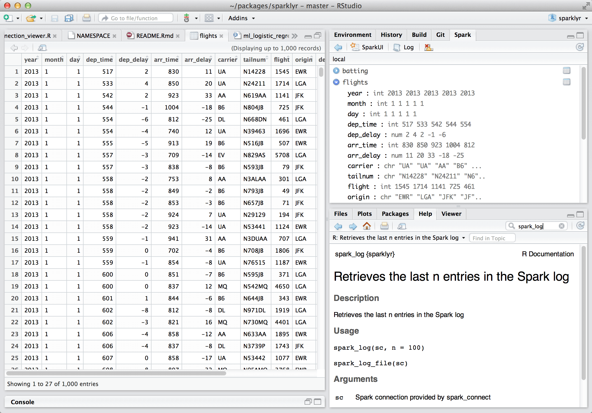 The latest RStudio Preview Release of the RStudio IDE includes integrated support for Spark and the sparklyr package, including tools for:
