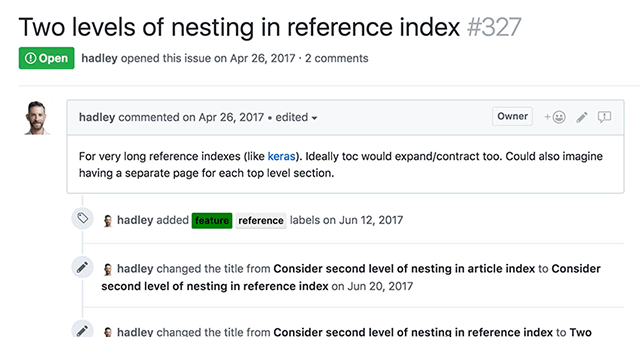 For the purposes of this post, let’s suppose you’ve found a bug or there’s a feature you’d like to see added to one of your favourite packages. Being the thoughtful user that you are, you’ve made your way to the appropriate GitHub repo. Before writing anything, you search the existing issues to see if it’s already there, or perhaps you’ve landed yourself in the open issue by way of searching for your error message. The point is: you have an issue, and you’re not alone — someone’s beat you to the punch/blazed a trail ahead of you.