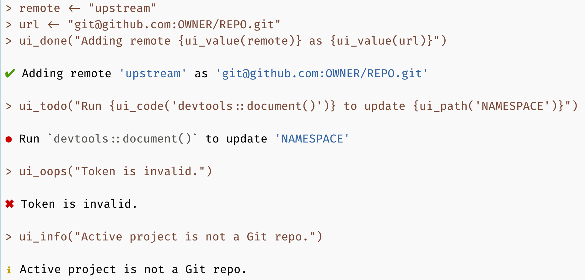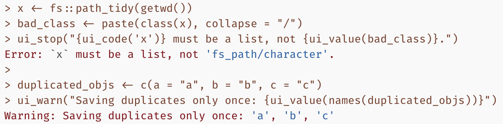 We’ve also exported the ui_*() functions that implement usethis’s messaging, conditions, and interactive menus. This is in response to repeated community requests. These functions benefit greatly from the