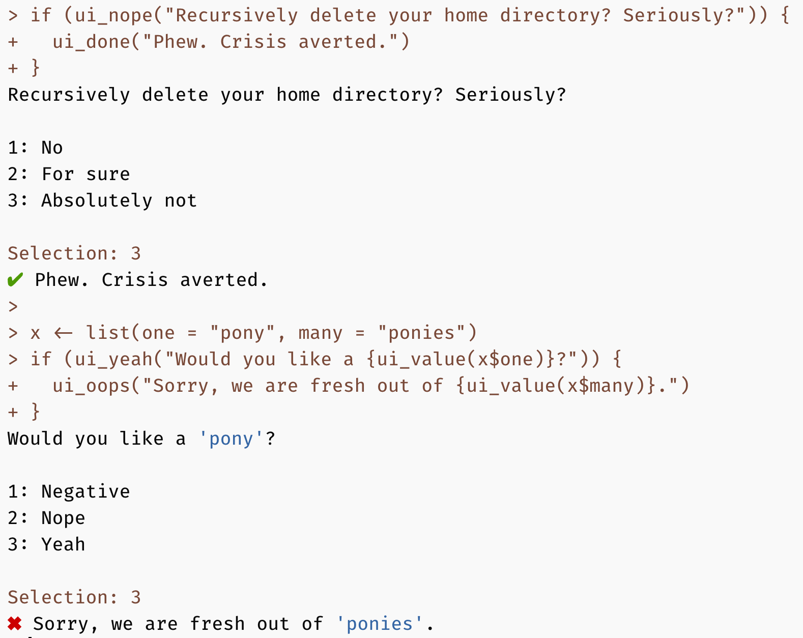 Finally, ui_yeah() and ui_nope() facilitate control flow based on user input: