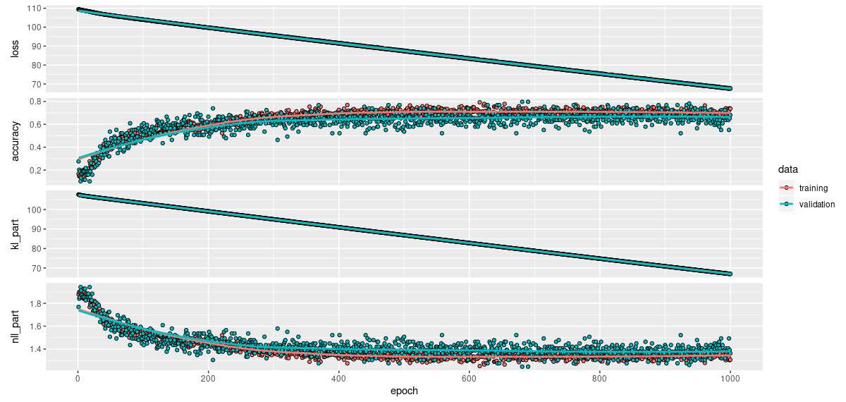 • Likewise, the user may influence the divergence function used to assess the mismatch between prior and posterior; in this case, we actually take some action: We scale the (default) KL divergence by the number of samples in the training set.