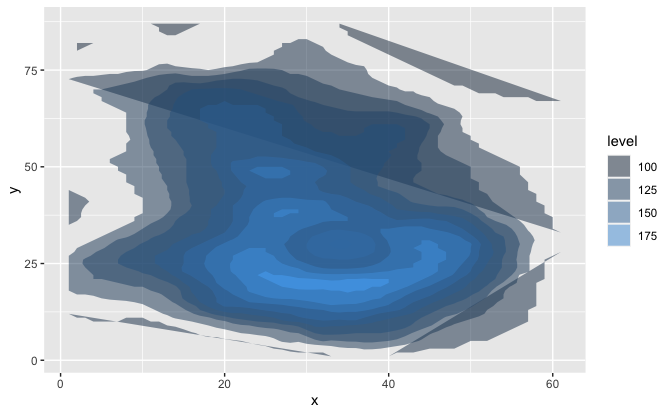 There is so much wrong going on here that we won’t go through it. In any case, this is all in the past because ggplot2 has moved on to using the new isoband package and now provides a geom for filled contours specifically: