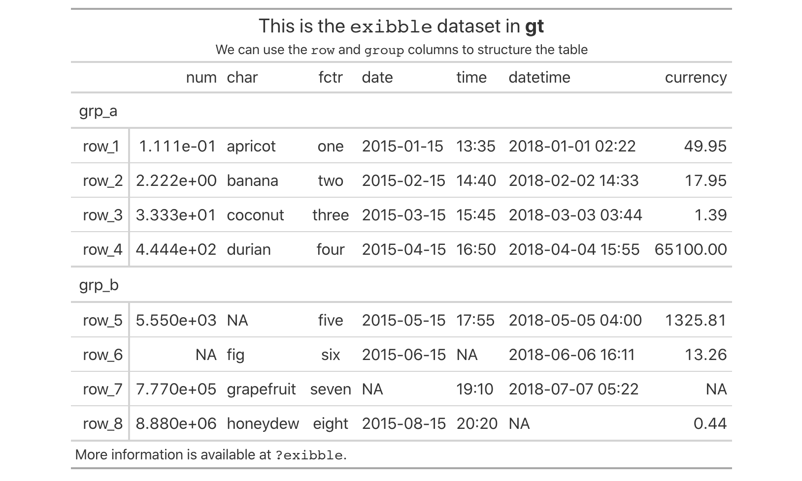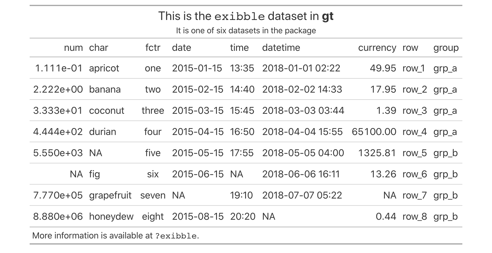 For an initial release, it’s pretty big! There are so many ways to structure a table, apply formatting and annotations, and style it just the way you want. Currently gt renders tables to the HTML output format (and has the ability to export to image files). We plan to also support the LaTeX and RTF output formats in the near future.