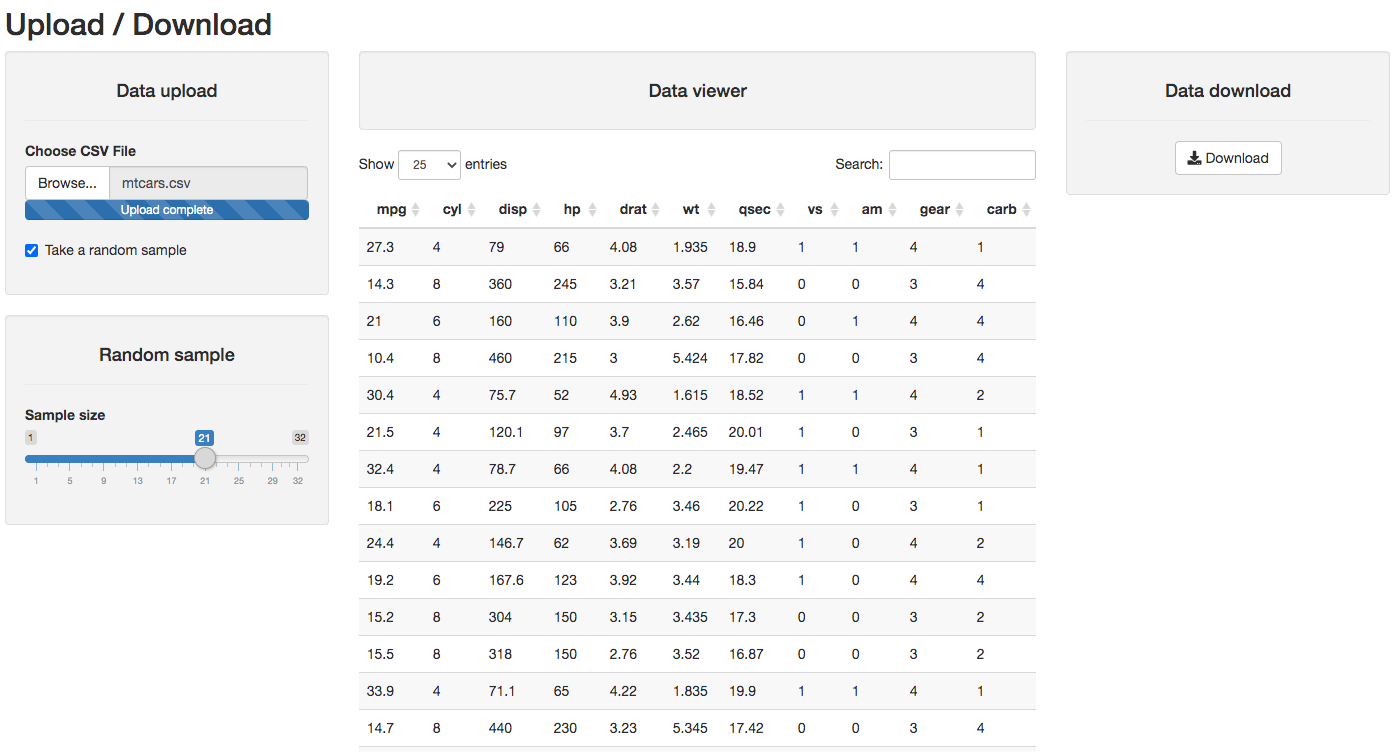 - The app is comprised of three columns with the titles “Data upload”, “Data viewer”, and “Data download”. The middle column is twice as wide as the columns in the left and right.