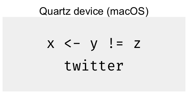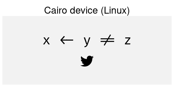 The Cairo device on Linux handles this task well, as we have noted above. How come this works, but only on one OS? Cairo is built in to most Linux distributions and is designed to work with Pango, the library that linux uses to layout text. R’s Cairo graphics device bundles Cairo on all platforms, but doesn’t include Pango, due to the challenges of building it on other operating systems.