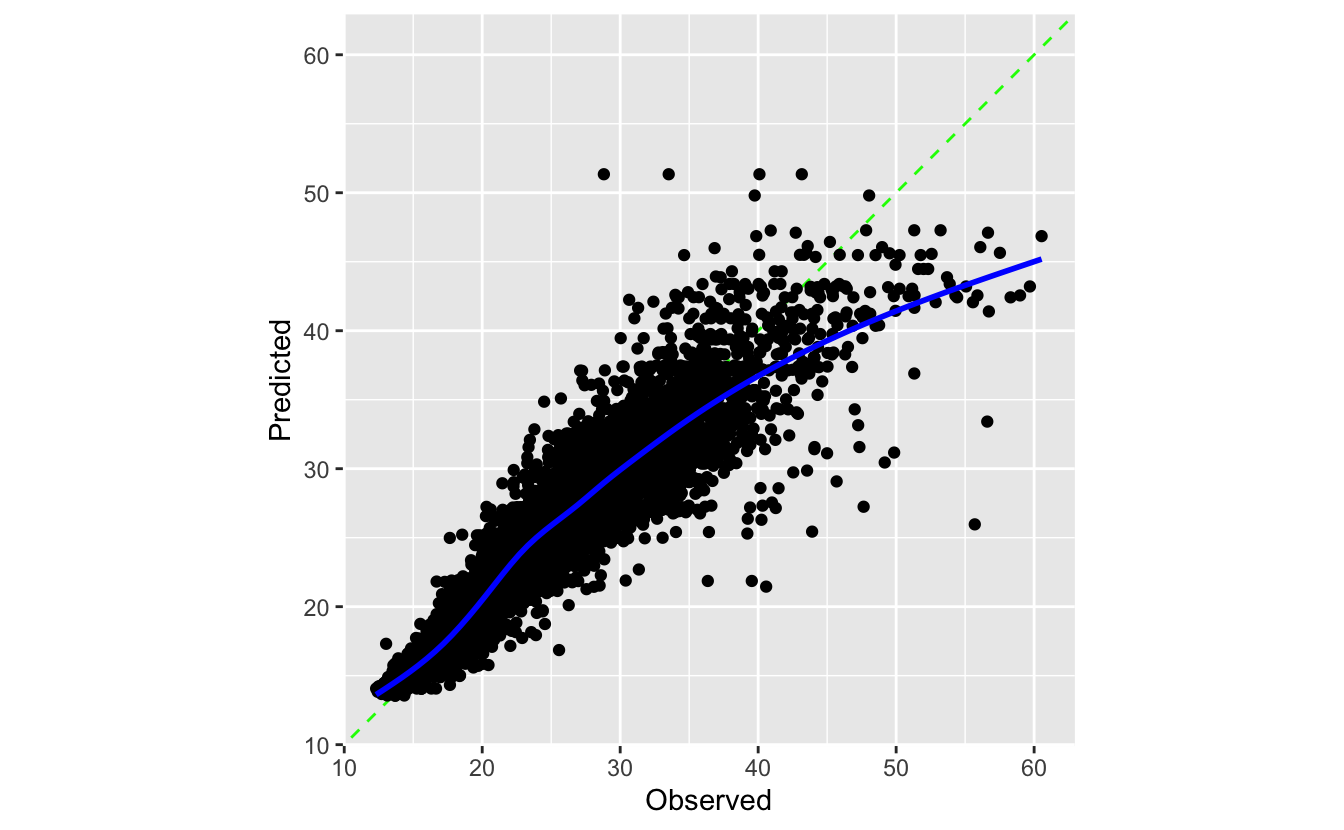 cal_plot_regression(truth = time_to_delivery, estimate = .pred)